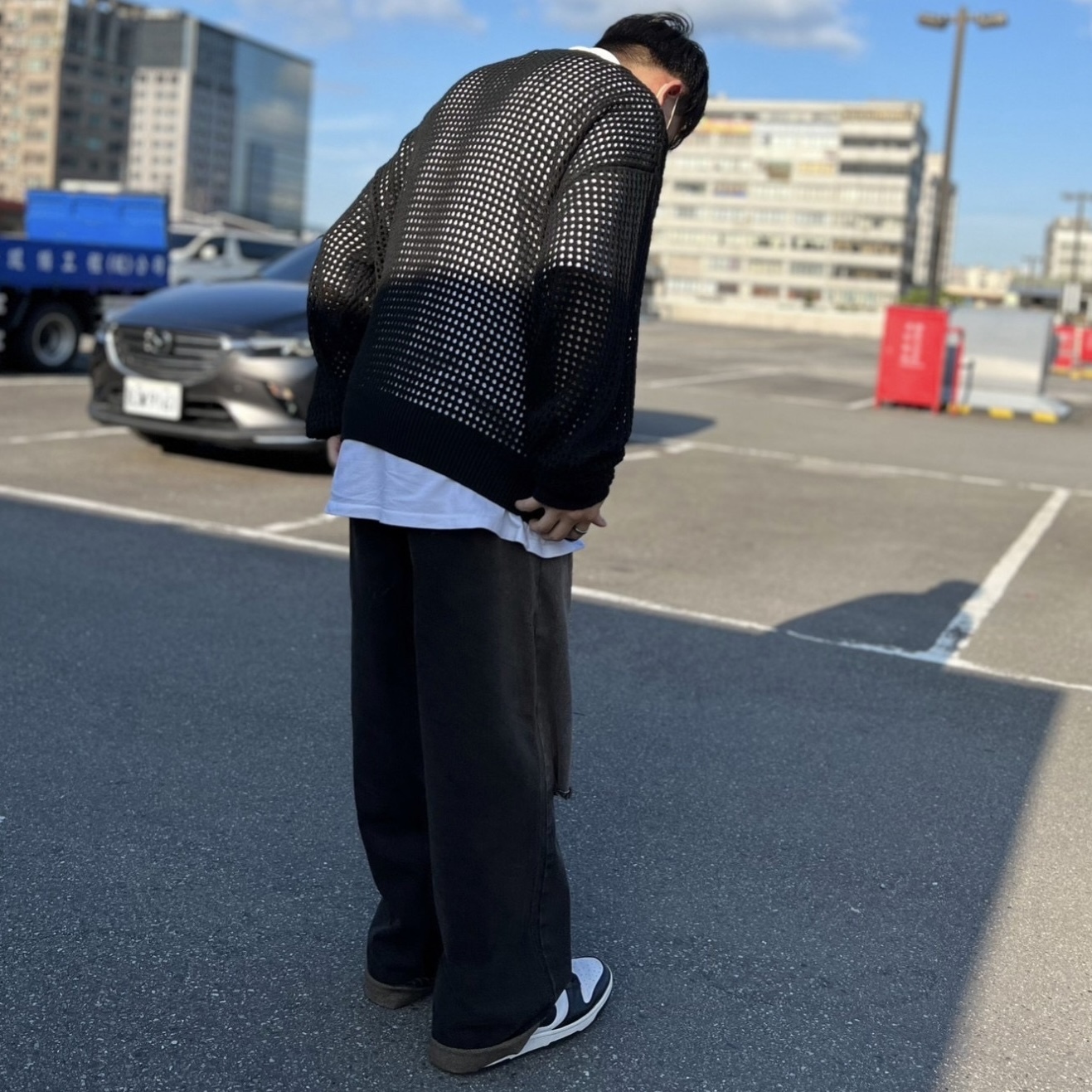 • 男模穿著韓國洞洞針織毛衣黑色側面照